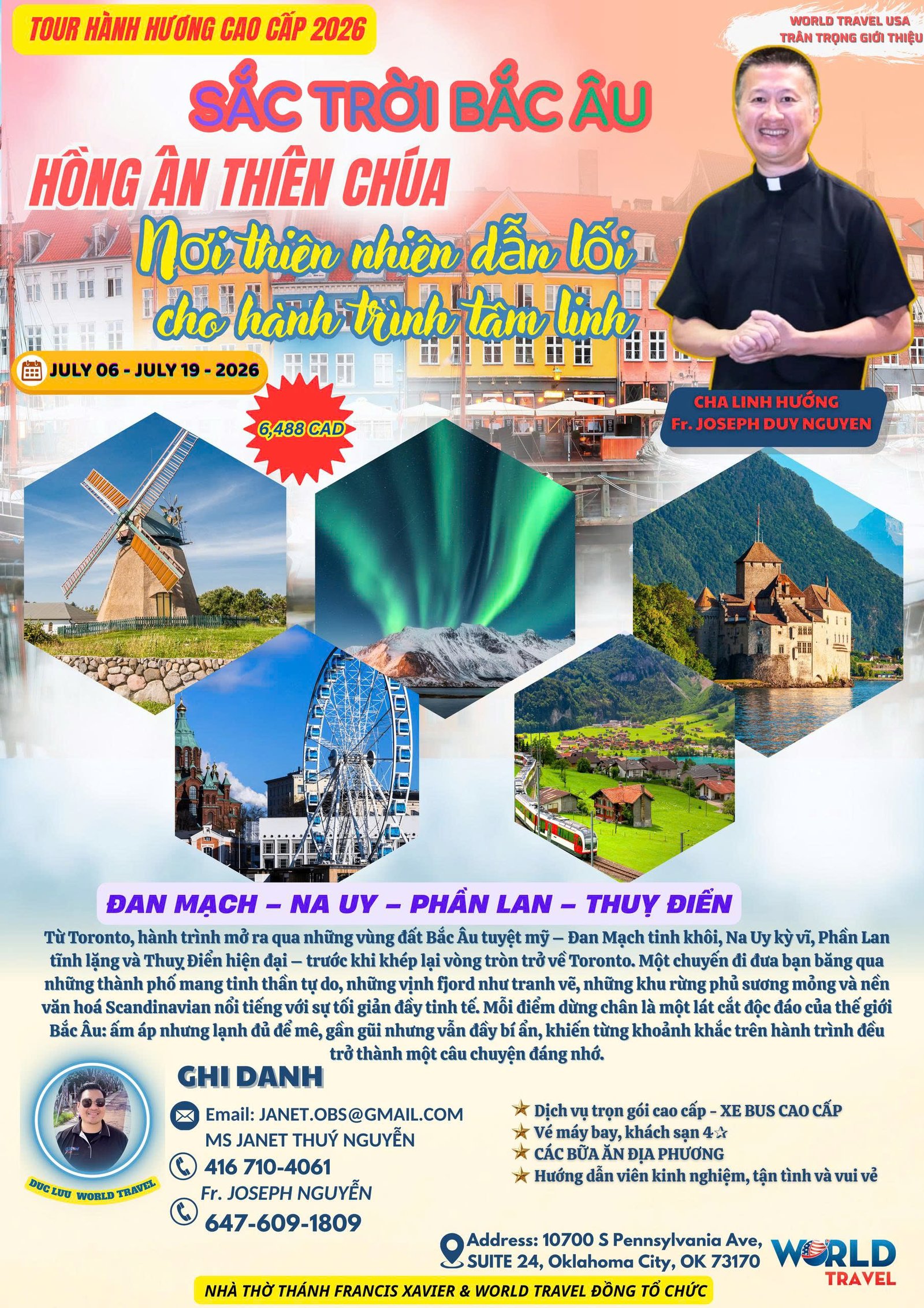 Đồng hành cùng World Travel USA – Tour Đông Âu 5 sao 2026 cùng Cha linh hướng Lm. Duy Nguyen mở ra hành trình 14 ngày sâu sắc và đầy ơn phúc, đưa quý khách đến Toronto – Đan Mạch – Na uy – Phần Lan – Thụy Điển. Không chỉ chiêm ngắm các thánh tích linh thiêng, quý khách còn được khám phá vẻ đẹp cổ kính của Bắc Âu, thưởng ngoạn văn hóa đặc sắc và trải nghiệm những khoảnh khắc tinh thần ý nghĩa trong suốt chuyến đi đẳng cấp này.